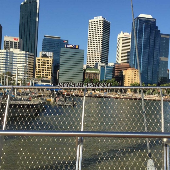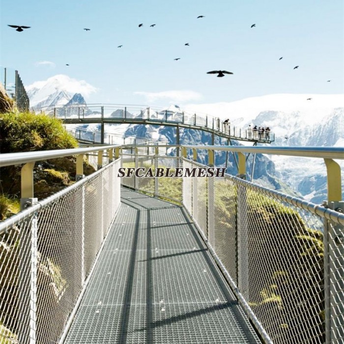 La malla de cable de protección de puente de acero inoxidable generalmente se usa en ambos lados del puente, se usa comúnmente en componentes de protección (pasamanos y barandillas), así como en las estancias de puentes colgantes, cables y tirantes, para evitar la caída de personas y automóviles En el agua, como una característica permanente de prevención de caídas para puentes, la malla de cable proporciona la combinación perfecta de seguridad, seguridad y elegancia, con la estructura fuerte pero delicada del sistema, que lo hace discreto pero altamente efectivo.